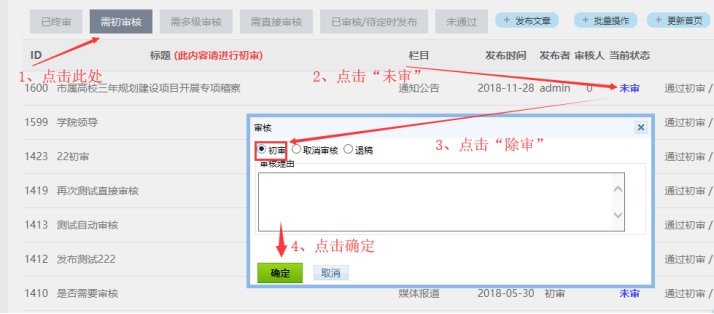 擁有該欄目內容初審權限的人,點擊“需初審核”進行相關操作即可。