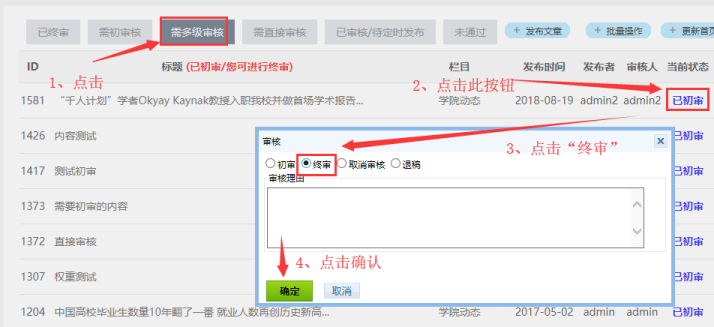 如果欄目內容需多級審核,就會用到“需初審核的內容”和“需多級審核的內容”。