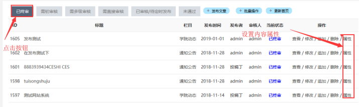一般對審核后的內容進行屬性設置;點擊已終審-------點擊屬性按鈕。