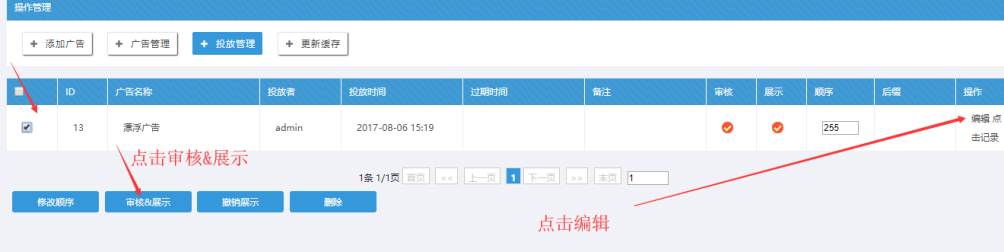 B:勾選漂浮廣告----點(diǎn)擊下面的審核&展示,先確保廣告是被審核過(guò)的------------然后點(diǎn)擊“編輯”
