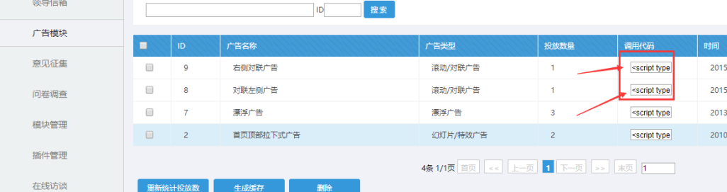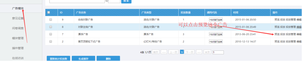 說(shuō)明:后臺(tái)的廣告模塊上生成對(duì)應(yīng)的廣告,然后生成的js調(diào)用到首頁(yè)的某個(gè)位置,這樣廣告就能在首頁(yè)顯示了。