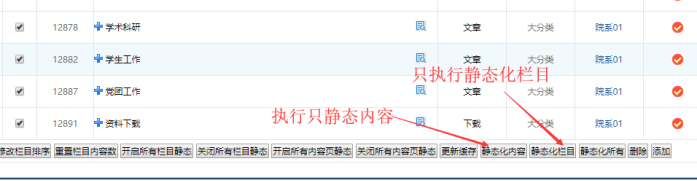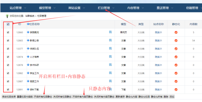 B:勾選所有欄目--------點(diǎn)擊靜態(tài)化欄目------------表示將欄目(不包括內(nèi)容)執(zhí)行下靜態(tài)--------小列表可以自動(dòng)靜態(tài),大分類(lèi)需要手工操作此處。所以后續(xù)要重新靜態(tài)內(nèi)容,需要分別點(diǎn)擊靜態(tài)化內(nèi)容和靜態(tài)化欄目。