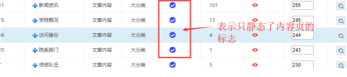 說(shuō)明:開(kāi)啟了內(nèi)容頁(yè)靜態(tài),他的標(biāo)志是是藍(lán)色的,如下圖。表示只靜態(tài)內(nèi)容,欄目保持動(dòng)態(tài)。