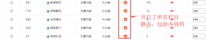 B:右邊的“開(kāi)啟所有內(nèi)容靜態(tài)”--------點(diǎn)擊下,表示開(kāi)啟了內(nèi)容頁(yè)靜態(tài),但是欄目不靜態(tài);標(biāo)志是藍(lán)色的。