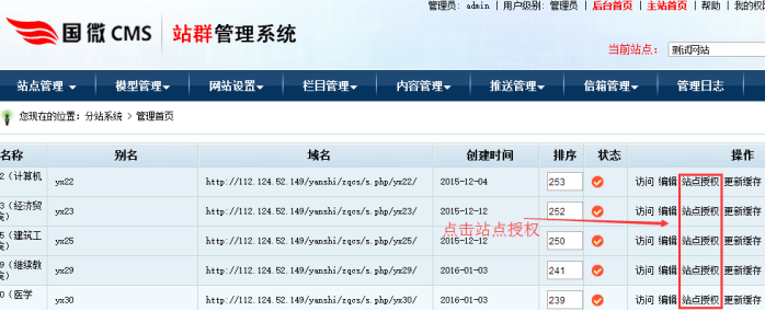 B:站點管理-----點擊“站點授權”;對各站點授權設置