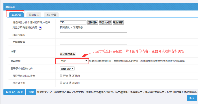 雙擊標簽后----切換到基本設置------選擇好對應欄目-----內容屬性選擇“圖片”---------然后提交,那么這么標簽就只會顯示帶圖片的內容