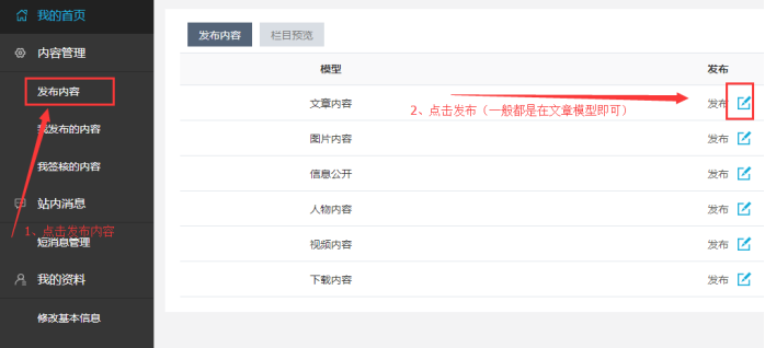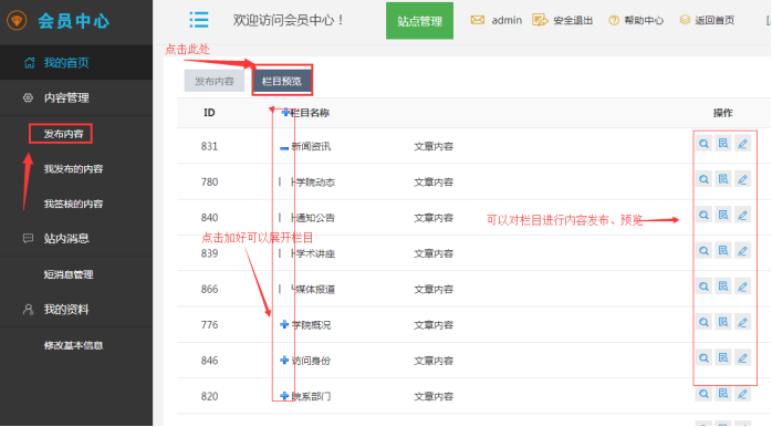 點擊此處可以直接對應的欄目下發布內容和預覽對應欄目,此處發布內容可以省略選擇欄目的過程。