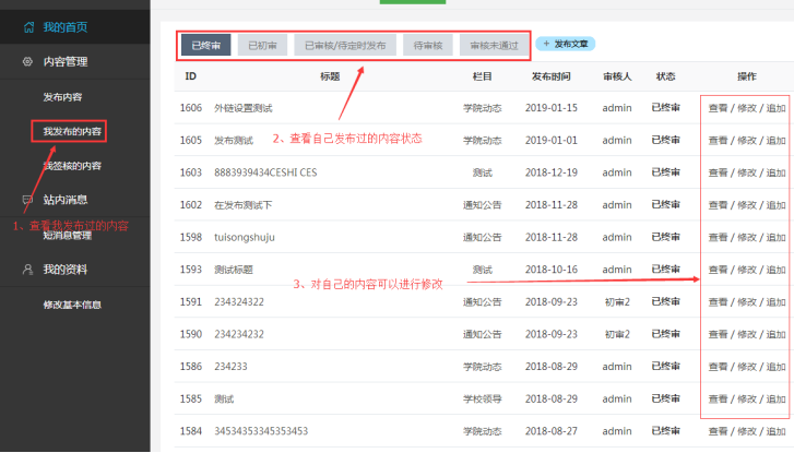 進入會員中心----我發布的內容------選擇發布的內容,各個狀態情況-------還可以對自己的內容進行修改(修改后的內容重新進入初始化審核狀態)。