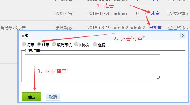 然后:選擇“終審核”(當然可以退稿)--------點擊“確定”按鈕,內容就審核通過了