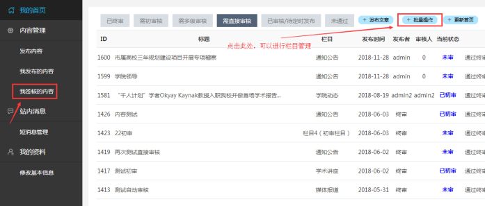 如果您是欄目管理員或系統管理員,需要對投稿人發布的內容進行審核,就是點擊此處。