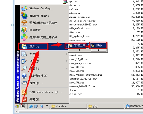 1)、點(diǎn)擊“開始”按鈕---選擇”程序”----管理工具---服務(wù),進(jìn)入服務(wù)界面