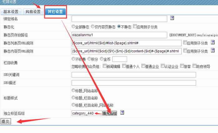此步驟備注下說明:如果你想小列表左邊的一些標簽都顯示同樣的內容,那么就將這些小欄目的后綴設置為一樣吧。點擊生成后綴,那個ID改為所需的,我們默認數據是440;當然填這些東西也可以,就留空吧,不影響。至于風格設置,一般的欄目就用默認的,無需設置。