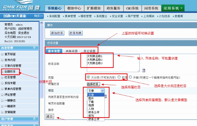2:創建下載小類別??梢耘縿摻?。上面三個欄目可以換行。然后選擇所屬大分類,就是剛剛那個創建的下載頻道。然后選擇下載模型,提交即可。