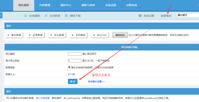 將現在最新的數據點擊備份下,便于新網站的數據還原