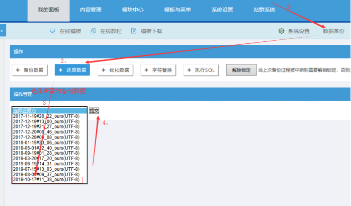 系統安裝后,務必不要更新緩存;先點擊“數據備份”---“數據還原”---“選擇你所需的數據備份文件”----點擊提交。