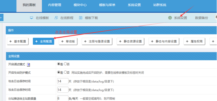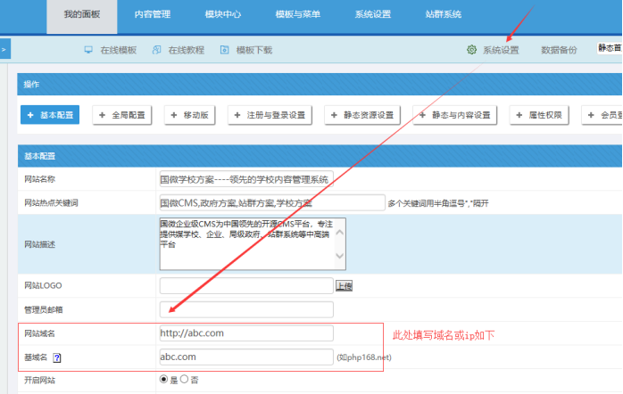 用舊網站后臺賬號密碼登陸后(或強制登陸后臺),此處就可以設置新的網站域名和基域名。