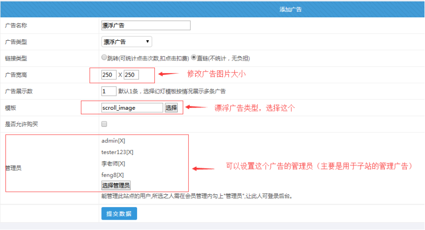 . 本廣告管理員:選擇可以管理此廣告的管理員(主要是用于站群子站可以設(shè)置自己的廣告)