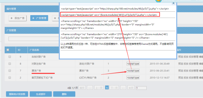 說明:要顯示廣告,就必須做如下動(dòng)作:進(jìn)入后臺(tái)的廣告模塊,創(chuàng)建對應(yīng)的廣告類型(比如漂浮型廣告、對聯(lián)型廣告),--------然后復(fù)制生成的js調(diào)用到首頁的某個(gè)位置--------最后再每個(gè)類型廣告下添加廣告-------再更新緩存靜態(tài)首頁,這樣廣告就能在首頁顯示了。