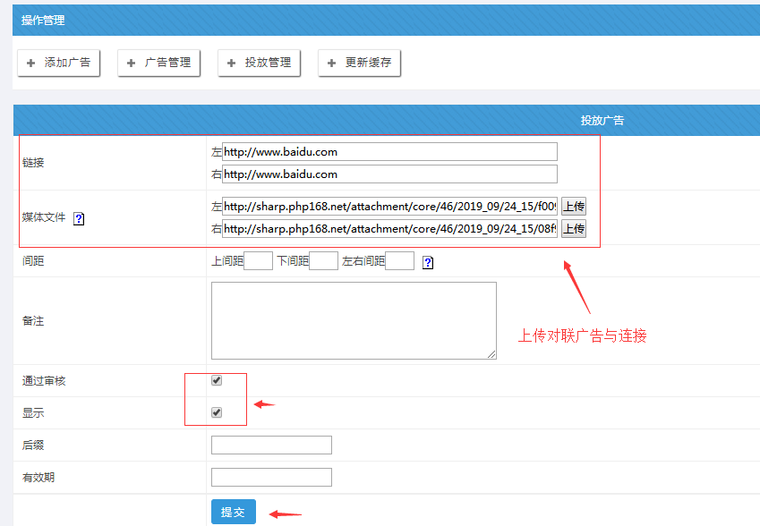 填寫好左右連接、上傳左右圖片;另外可以設(shè)置對聯(lián)廣告上下間距。