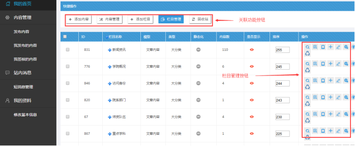 點擊批量操作----頂部有內容管理、欄目管理、回收站等快捷按鈕-------右邊有欄目管理按鈕