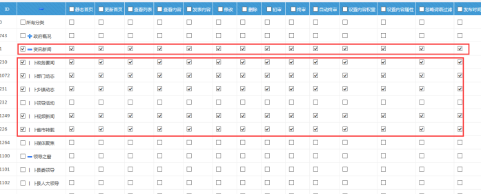 D:如果此人有管理欄目的權限,下圖所示(上級欄目也必須勾選中, 否則無權限,左邊可以快捷選擇按鈕)