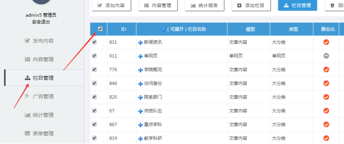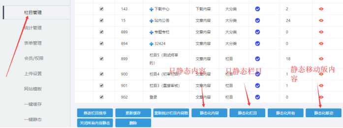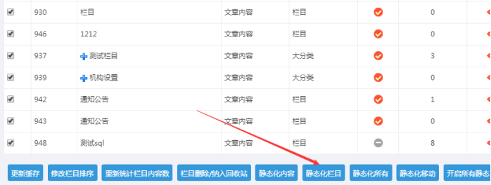 進入后臺------點擊欄目管理------勾選所有欄目--------點擊靜態(tài)化欄目即可(小列表可以自動靜態(tài),大分類需要手工操作此處。所以我們需要經(jīng)常點擊靜態(tài)欄目)