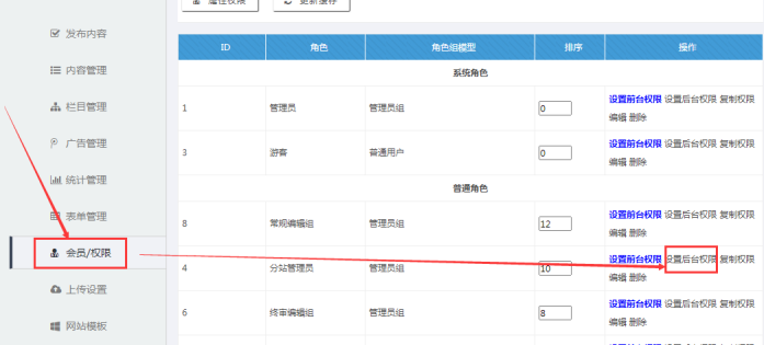 A:后臺--點擊【會員/權限】---找到【常規編輯組】或其他用戶組---點擊右邊的【設置后臺權限】
