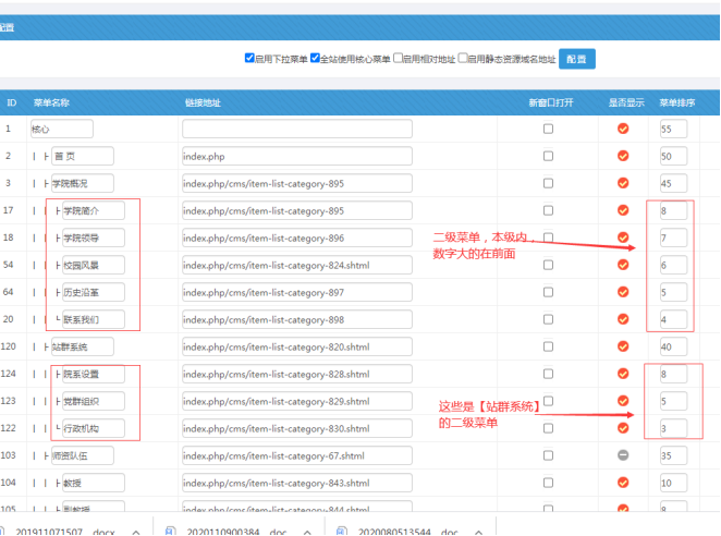 比如:我們需要對【學院概況】、【站群系統】下這些二級菜單進行內部排序,設置數字后,提交即可!