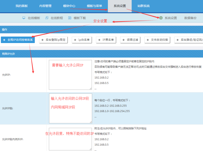 為了方便我們對各個欄目、內容、站點開啟只供局域網內訪問,我們可以設置公共的局域網訪問IP段。里面包括了允許公網ip、局域網IP段等。