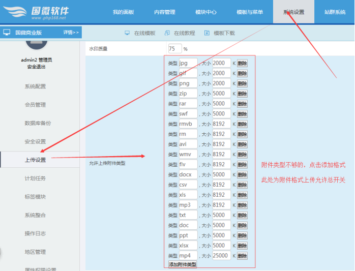 總開關設置后,還可以控制各個角色允許上傳的附件類型;其中游客原則上不允許上傳附件;其他角色根據情況定義。