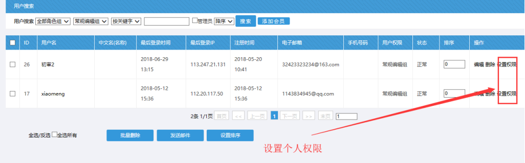 下圖可以看到角色下面的各個賬戶,點擊用戶后面的【設置權限】按鈕,就可以對此賬號設置他的權限了: