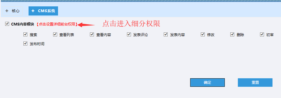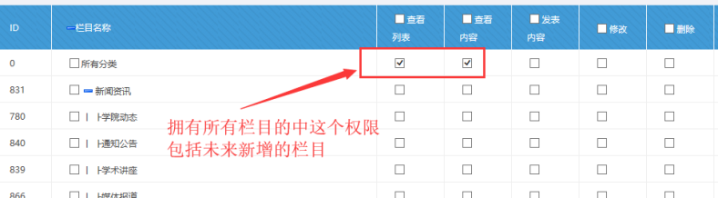 下圖可以勾選所有分類的按鈕。表示該角色對所有欄目,擁有欄目查看、內容查看的權限: