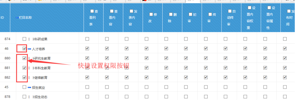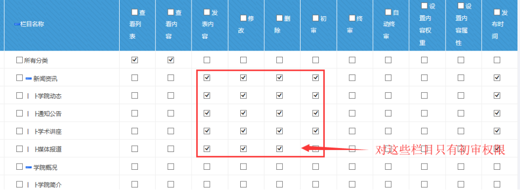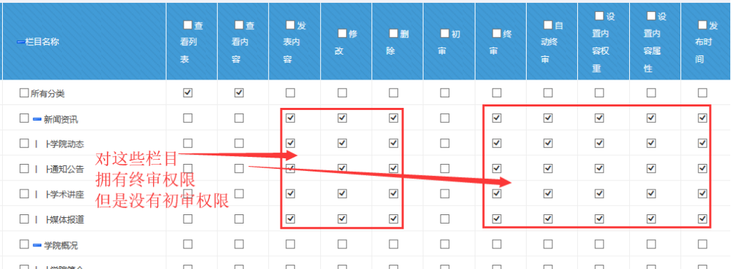 如果是欄目管理員,管理這些對應欄目,就可以勾選這些欄目的右邊全部權限
