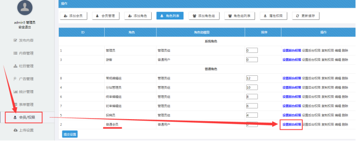 A:進入系統后臺----【會員/權限】-----假設普通個人這個角色設置權限----點擊“設置前臺權限”