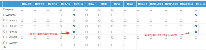 D:如果只要此人對某些欄目有發布權限,設置如下:(上級欄目必須勾選中,一般是自動的,否則無權限)