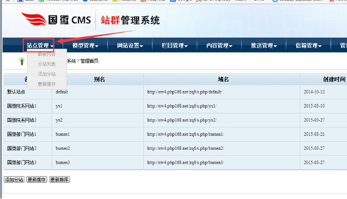 A:站點(diǎn)列表;進(jìn)入后可以看到自助站群管理界面;點(diǎn)擊站點(diǎn)管理,可以看到已經(jīng)建好的分站清單