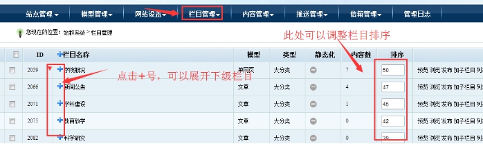 欄目排序:大的數(shù)字排在前面;數(shù)字大小是同級(jí)欄目比較。
