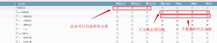 B、如果我要選擇某個幾個欄目的管理權限,必須要先勾選它的上級欄目,如信息快報。然后將不是屬于自己的欄目的可以去掉勾選(這點很重要,大欄目必須要勾選的)。