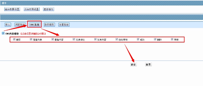 3、進入后,選擇上面的“CMS系統”----全選那些按鈕---最后點擊”確定”