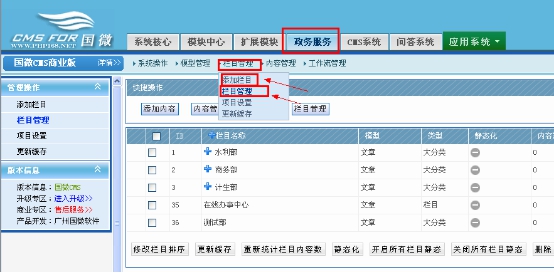 A、點(diǎn)擊政務(wù)服務(wù)—欄目管理—添加欄目;當(dāng)然我們事先可以點(diǎn)擊下欄目管理,看下那些創(chuàng)建好的欄目是如何的。