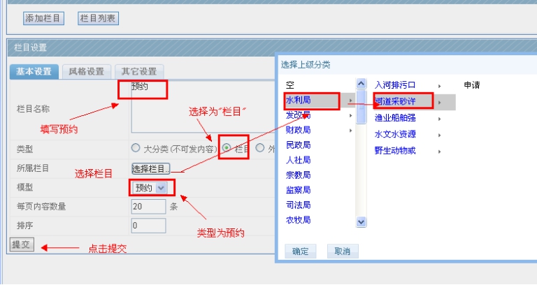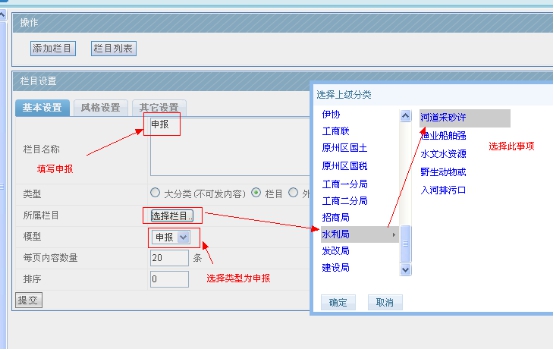 A、 給水利局—---河道采砂這個(gè)事項(xiàng),添加一個(gè)申報(bào)欄目;點(diǎn)擊添加欄目,輸入“申報(bào)”二字,類型選擇“欄目”(最小列表都選欄目),模型選擇申報(bào)模型,選擇后對(duì)應(yīng)辦事欄目,其他地方默認(rèn),然后點(diǎn)擊提交。