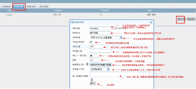 D、拓展字段:每個(gè)部門、每個(gè)辦事的申報(bào)模型里面,他都可能會(huì)有自己的字段;比如這個(gè)采砂申請(qǐng),就可能要用戶提供采砂船只數(shù)量、采砂人數(shù);在這里我們可以添加各種自定義字段來(lái)滿足要求。添加自定義字段是整個(gè)系統(tǒng)一個(gè)公共的基本知識(shí),我們會(huì)單獨(dú)發(fā)個(gè)教程說(shuō)明,屬于網(wǎng)管需要掌握的重要知識(shí)。