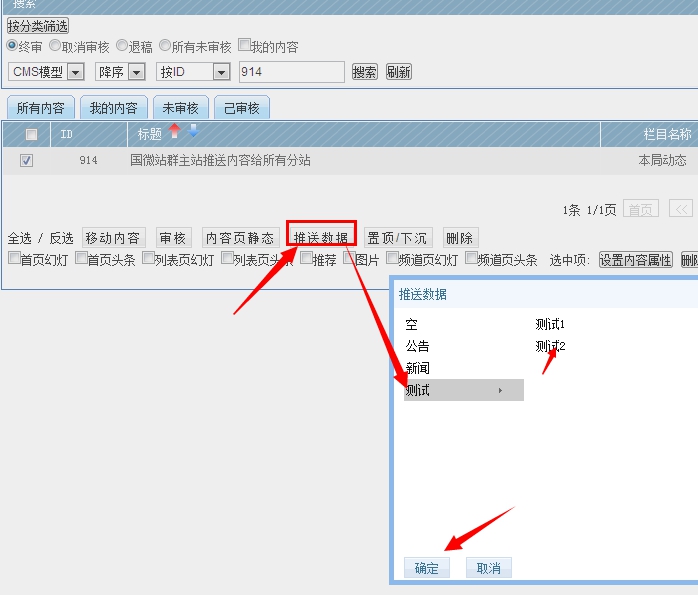 B \點擊推送數據---選擇站群里面的欄目,那么這篇內容就會推送到站群里面設置的欄目里,當然,又會自動轉發給主站的對應欄目。因為他們做了欄目對接了。