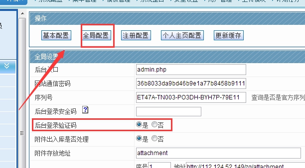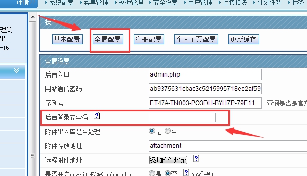 2、開啟后臺登陸安全碼設置(全局設置里面);