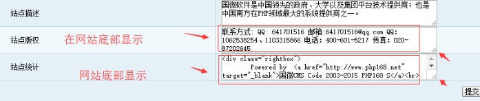 站點版權: 會在網站底部顯示;主要網站的電話號碼和聯系方式,見紅框處。