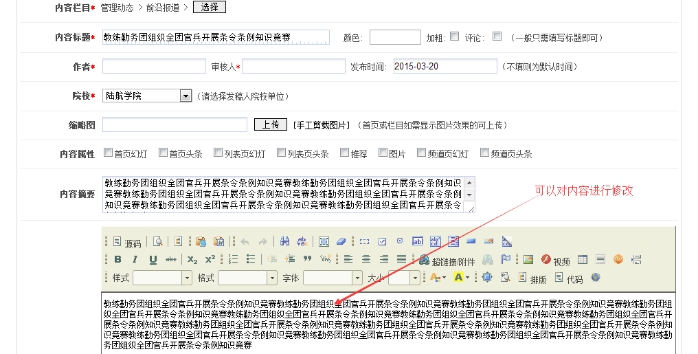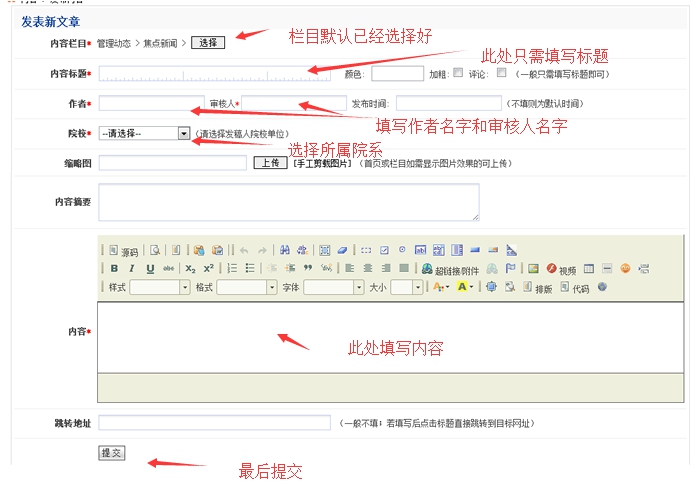 B:一般的必填字段是:內容標題、作者(發文者姓名)、審核人(各個院系指導員)、院校(選擇各自院系)、內容(主體內容)