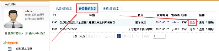 3、點擊”待審核的文章”或”已經簽核的文章”按鈕,點擊修改