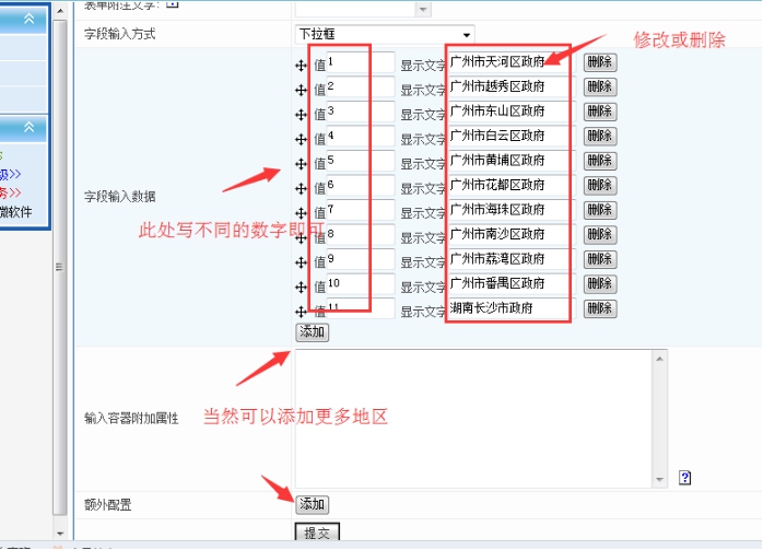 3、進(jìn)入后,里面可以修改現(xiàn)有的地區(qū)。也可以添加更多地區(qū)。左邊的那個值是數(shù)字,可以任意添加,但是需要不同。最后點擊提交。
