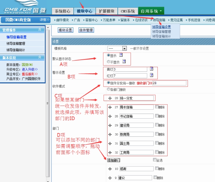 信件接收統一分發:就是用戶提交信件時候,不需要在選擇部門了,默認發到某指定的部門信箱。然后再由此信箱轉發給其他部門;至于由哪個部門(或欄目)接收信件,只需用戶填寫部門ID即可。比如我們命名了一個統一分發的部門欄目,ID為28填入即可。