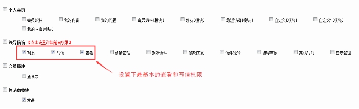 然后點擊上面的【點擊詳細設置前臺權限】 ,進入此頁面。勾選需求的權限。左邊的列表、寫信、查看權限是必須的,所以必須給予。右邊的管理權限,根據此用戶需要管理的內容來定。